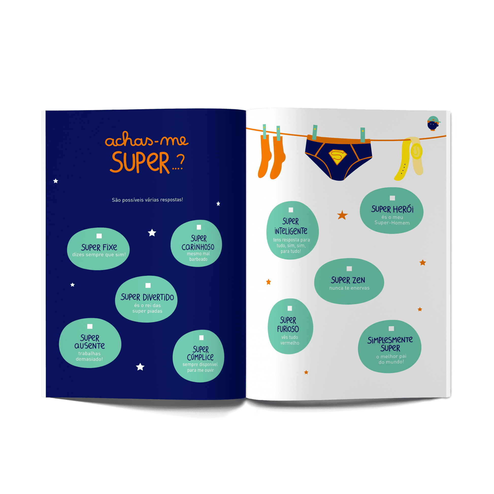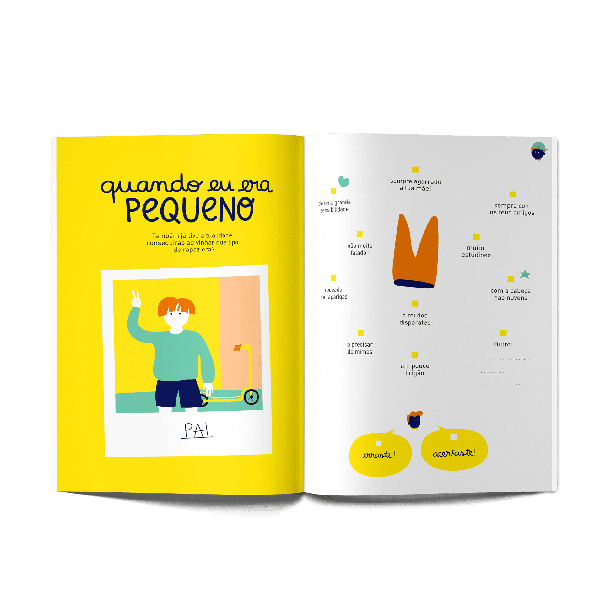 Livro com jogos, desenhos e perguntas para preencher pelo pai e pelo filho.