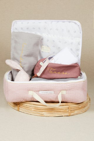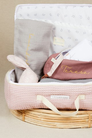 Feita em algodão, este modelo vintage é ideal para levar as primeiras roupas e acessórios do bebé para a maternidade e acompanha-lo na sua primeira viagem: da maternidade para casa!