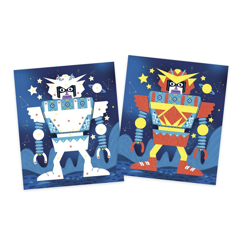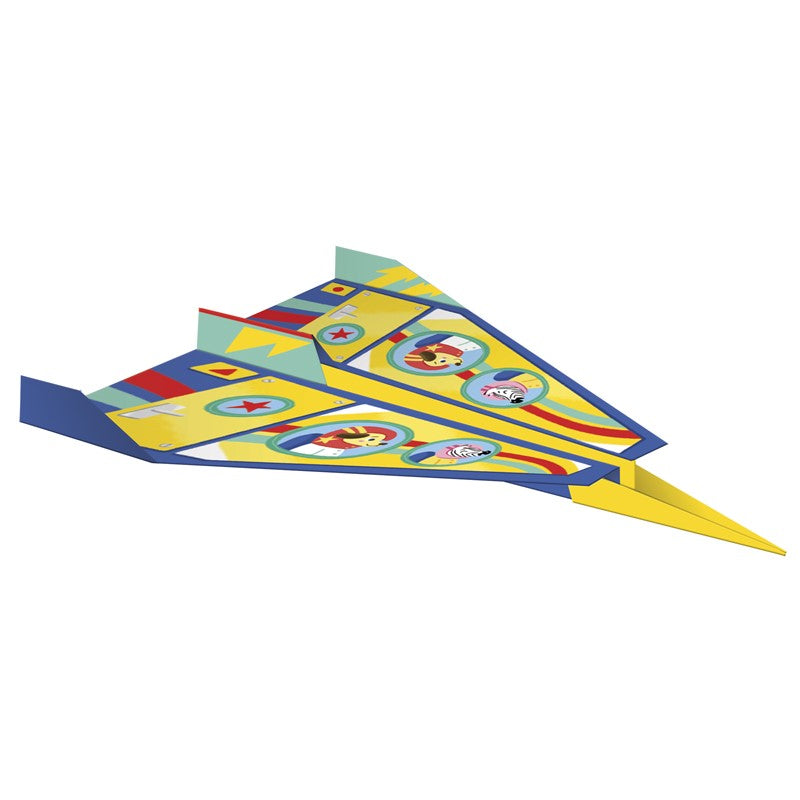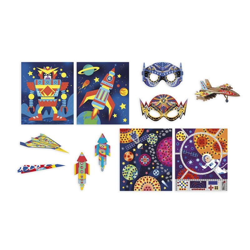 Dobre, cole, faça, este kit permite fazer 4 aviões de papel, 2 foguetes espaciais e sua nave auxiliar, 2 tintas de lantejoulas, 2 tintas de areia, 2 máscaras e 1 modelo de avião, tudo com a ajuda de um livreto de instruções.