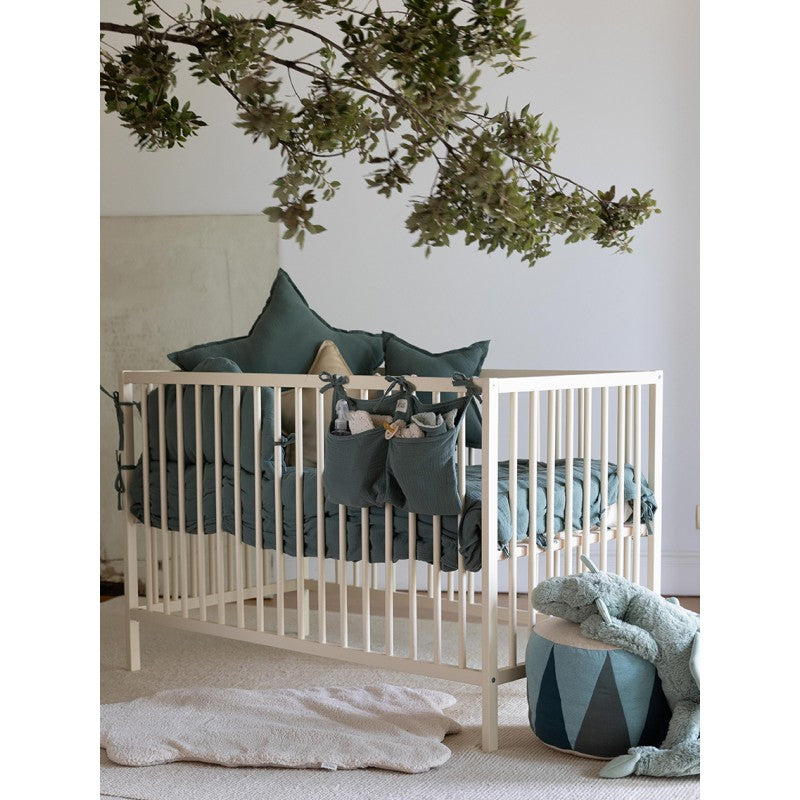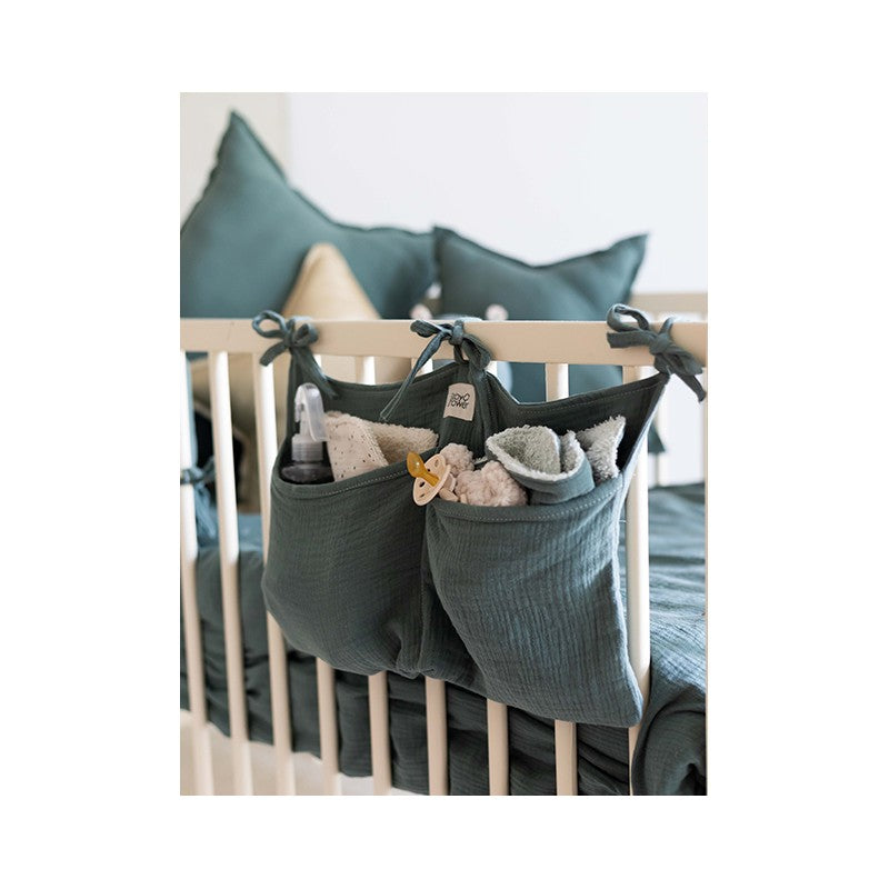 Prático organizador para prender ao berço e armazenar os pequenos acessórios tão necessários à hora de dormir do bebé.